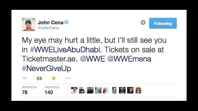 أكد جون سينا عبر حسابه على تويتر مخاطبا حساب WWE العربي على تويتر @WWEmena بأنه سيكون حاضرا لمواجهات جولة WWE في أبوظبي.