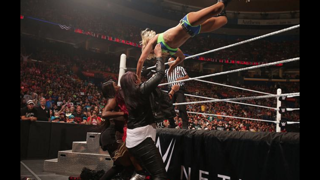 النهاية جائت عندما حاولت ساشا بانكس وضع شارلوت في وضع الاستسلام لتقوم بري بيلا بالقائها خارج الحلبة و لتحاول هي استغلال سقوط شارلوت “أبنة الاسطورة ريك فلير” أرضا ليترد عليها شارلوت بحركة فينجر 8 لتستلم بري بيلا مباشرة.