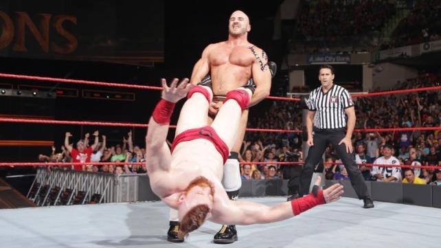 وفجأة استطاع شيموس أن يستعيد السيطرة مرة أخرى ليحاول إنهاء النزال لصالحه ولكن سيزارو كان بالمرصاد حيث استطاع مباغة شيموس بحركته الدوارة الرهيبة.