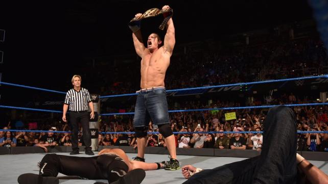 أي جاي ستايلز يفوز على دين أمبروز بعدها يدخل جون سينا ليحطم الاثنين.